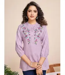 Mauve Floral Embroidered A-Line Top with Mandarin Collar & Pu...