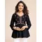 Black & Red Floral Embroidered Shirt-Style Top with Lapel Collar and Bell Sleeves
