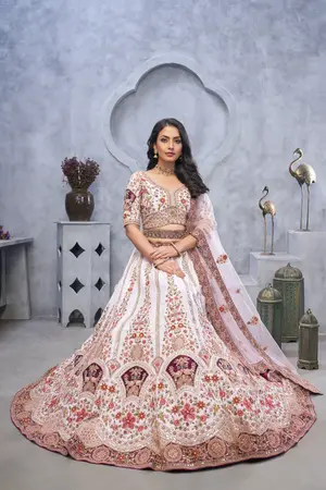 The aesthtic purple lehenga, featuring beautiful zari embroidery in an intricate paisley pattern with rich Organanz silk fabric. The delicate Velvet patches along with peacock motifs bring a unique texture, elevating its luxurious appeal. This masterpiece exudes sophistication, making it a perfect choice for the brides . Pair with nude block heels.