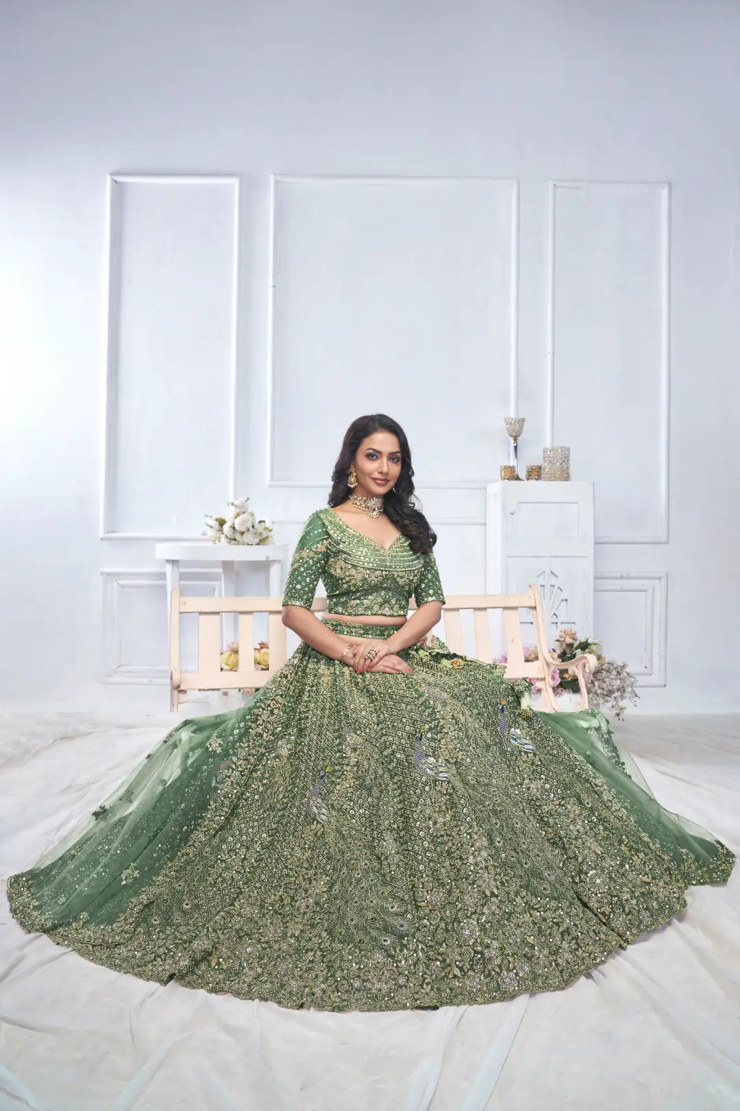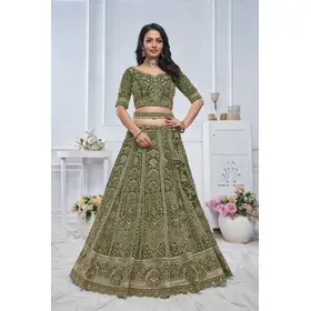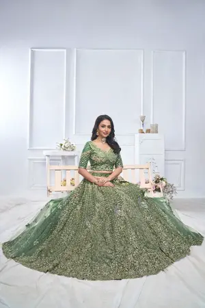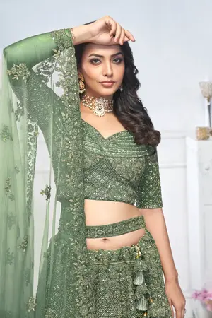 This Green lehenga erfect for mehendi showcases aari embroidery with floral, and peacock, motifs, all enhanced with stone and zari work embellishments. The kali cut skirt features scalloped borders and pillow trim latkan, complemented by a matching embroidered blouse and net dupatta with embroidered borders. Opt for gold jewellery to highlight the intricate details. Suitable for weddings or traditional festivities, the lehenga exudes a regal charm.