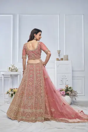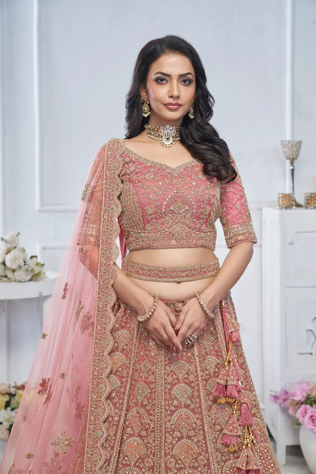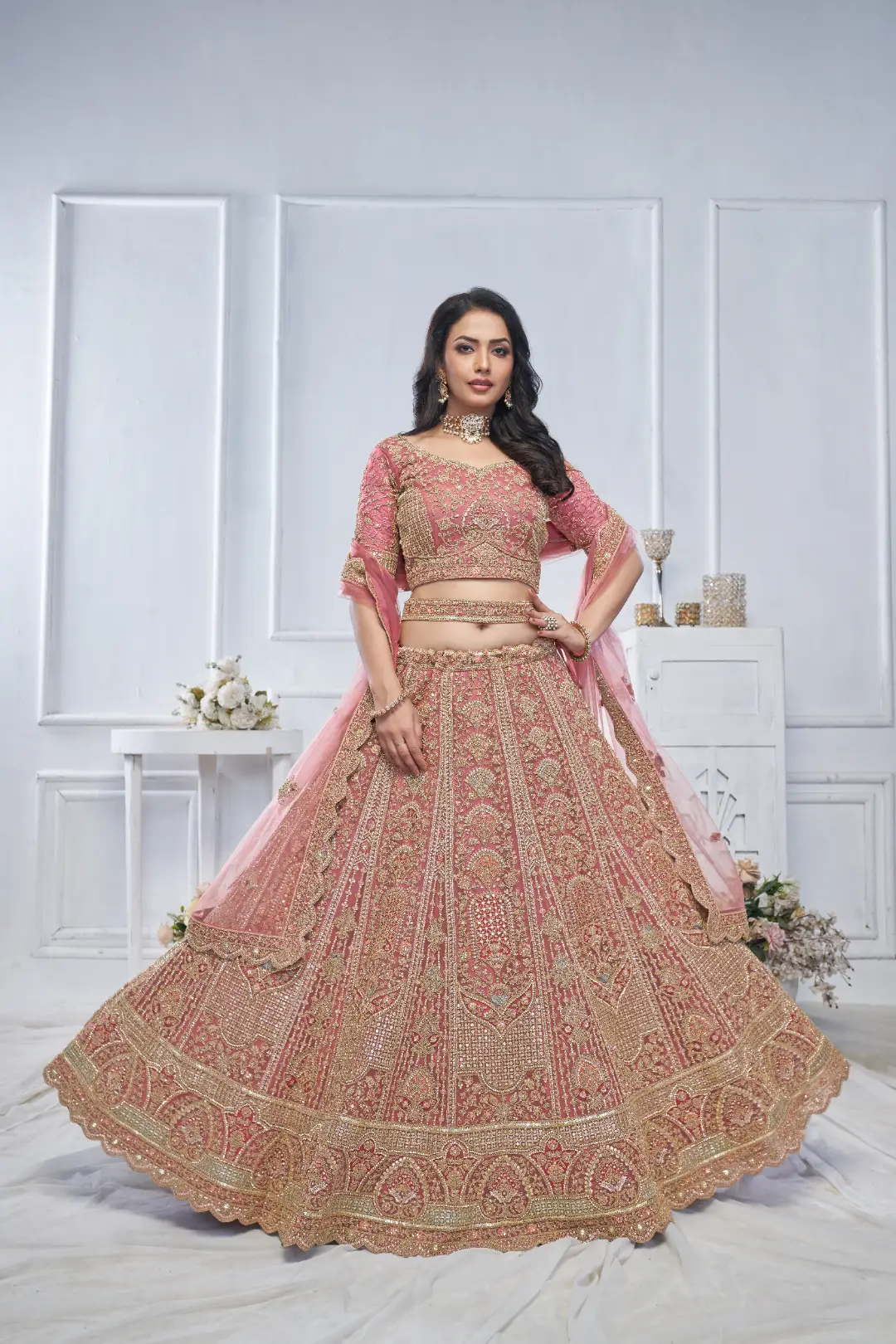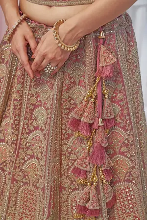 Make a grand entrance with this Mauve crop top lehenga. Crafted from soft net Fabric, this ensemble exudes elegance and sophistication. The lehenga features Seamless paisley flower border and motif design adorned with shimmering sequins and zari work, adding a touch of opulence. The bottom of the lehenga showcases a stunning scallop design, enhancing its regal appeal. Perfect for weddings, receptions, and grand celebrations, this outfit ensures you stand out with your impeccable style.