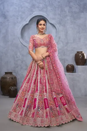 Designed for the new-age bride, this Magenta (Purple) bridal lehenga . Crafted from premium art silk, beautifully adorned with intricate hand embroidery, dazzling sequins work, detailed thread artistry, and luxurious zari embellishments that add a touch of regal charm. The ensemble comes complete with a coordinating blouse, stylish latkan, a sleek belt, and a flowing dupatta to create a graceful look. Perfect for brides who want to make a bold yet sophisticated statement on their big day.