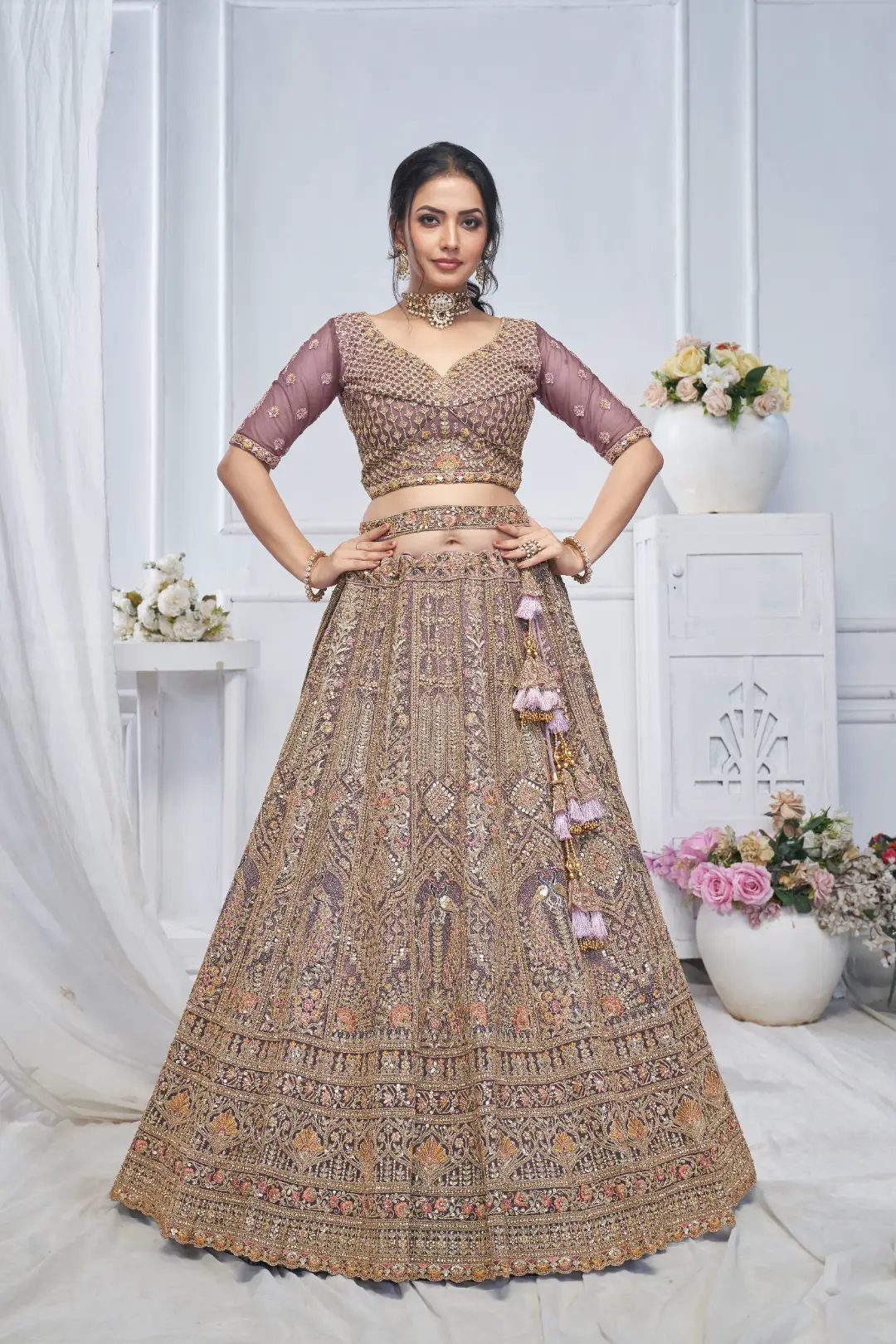 This elegant Purple Lehenga set on a fine net fabric, Embroidered with classic paisley pattern intricately woven across the lehenga adds a timeless appeal, while the rich peacock motifs bring a sense of royalty and grandeur. A complementing blouse with a waist belt and charming latakan paired with the skirt. The ensemble is matching sheer net dupatta.