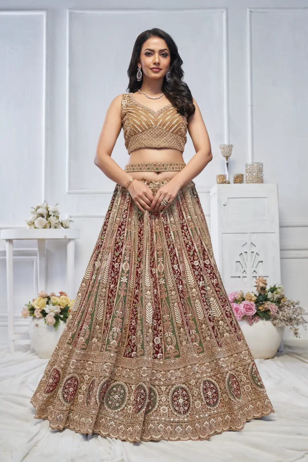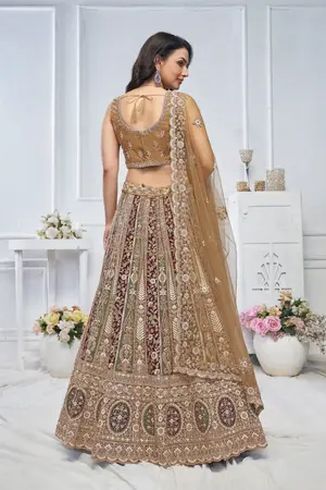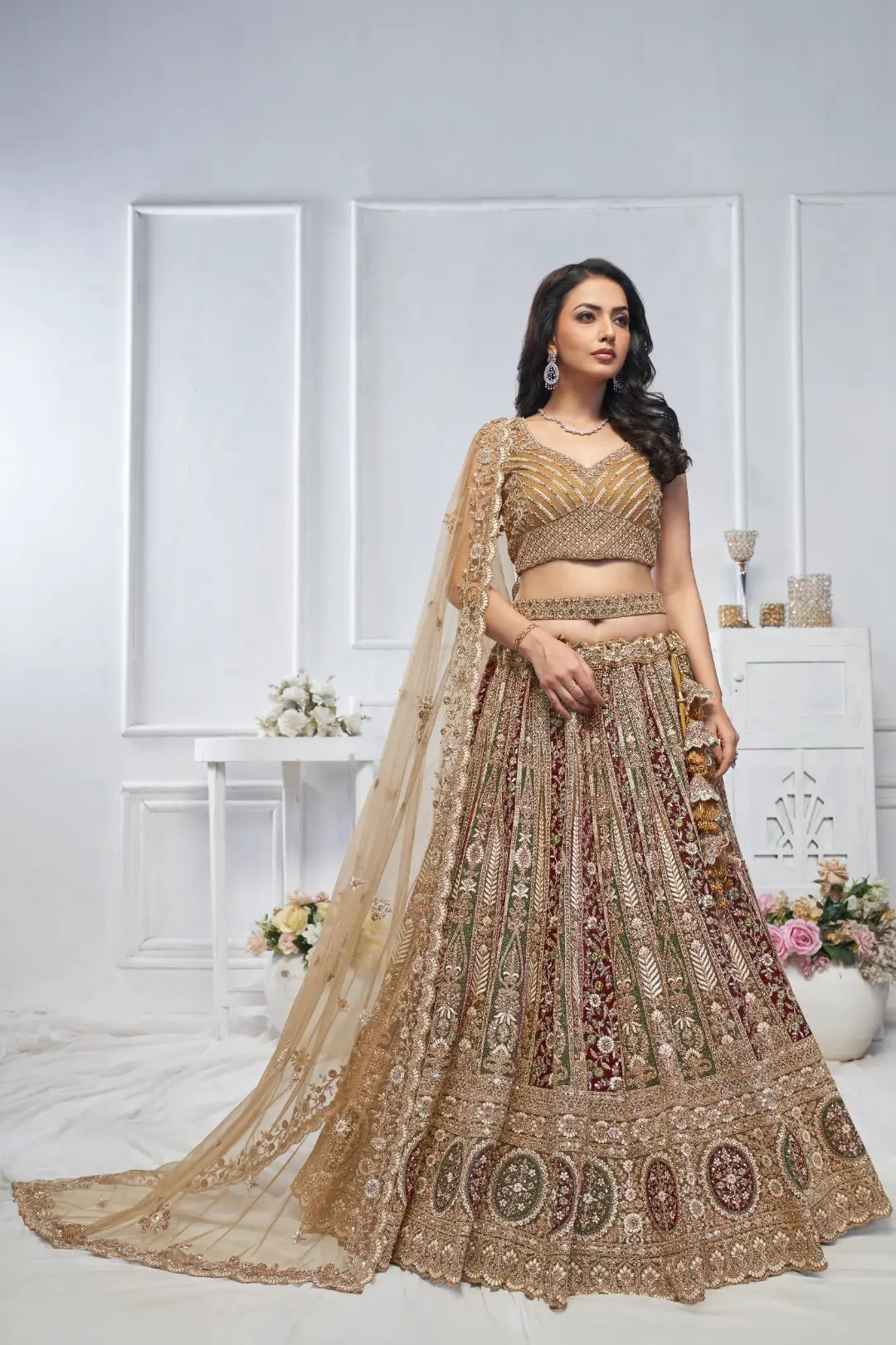 Majestic Mustard lehenga is adorned with an alluring mix of paisley, floral, and leaf patterns throughout its flowing skirt, intricately embellished with Zari, and thread work . It is paired with a V-neckline blouse that adds a touch of elegance and an embellished waist belt with square-trimmed latkans. The ensemble is completed with a delicate net dupatta, featuring embroidered floral buta motifs and a beautifully embroidered border. For styling, accessorize with gold or pearl drop earrings and a sleek, low bun to accentuate the neckline and detailed embroidery, perfect for a festive or wedding occasion.