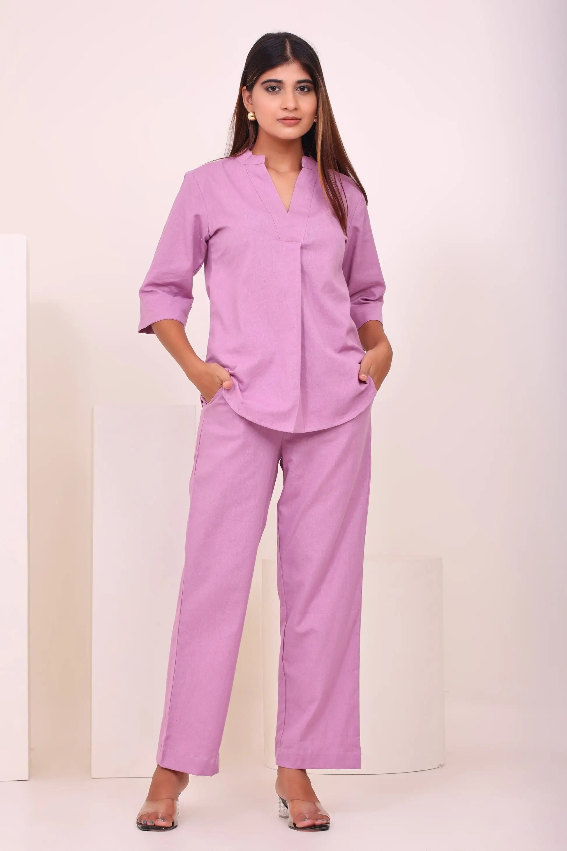 Crafted from soft and breathable fabric, this set combines style and comfort effortlessly. The chic top features a smart V-neckline with 3/4 sleeves, while the matching pants offer a relaxed fit and deep pockets for added convenience. Perfect for both casual outings and semi-formal events, this co-ord set ensures you step out in style!