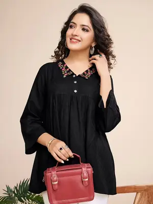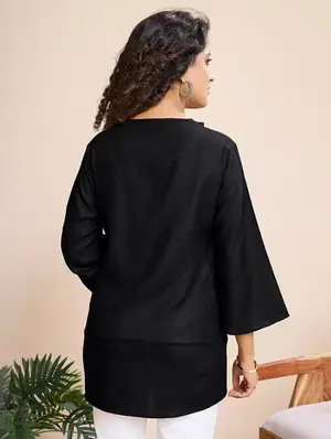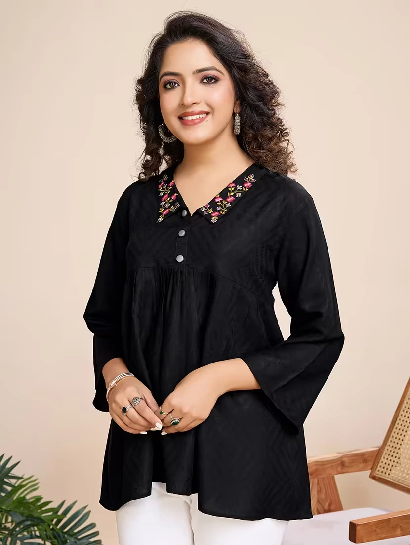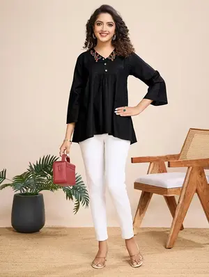 The shirt collar and button-down front offer a structured, shirt-style appeal, while the three-quarter regular sleeves keep it versatile and season-friendly. Whether you're dressing for a festive gathering, a creative workday, or a casual dinner, this top blends sophistication with ease. Pair it with slim-fit trousers or flared palazzos for a head-turning ensemble.