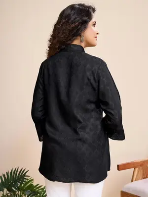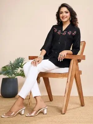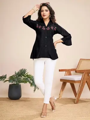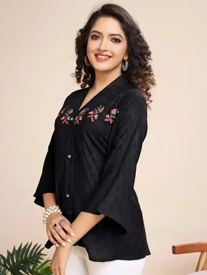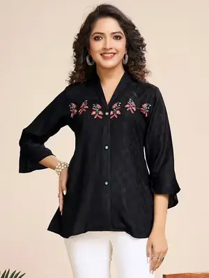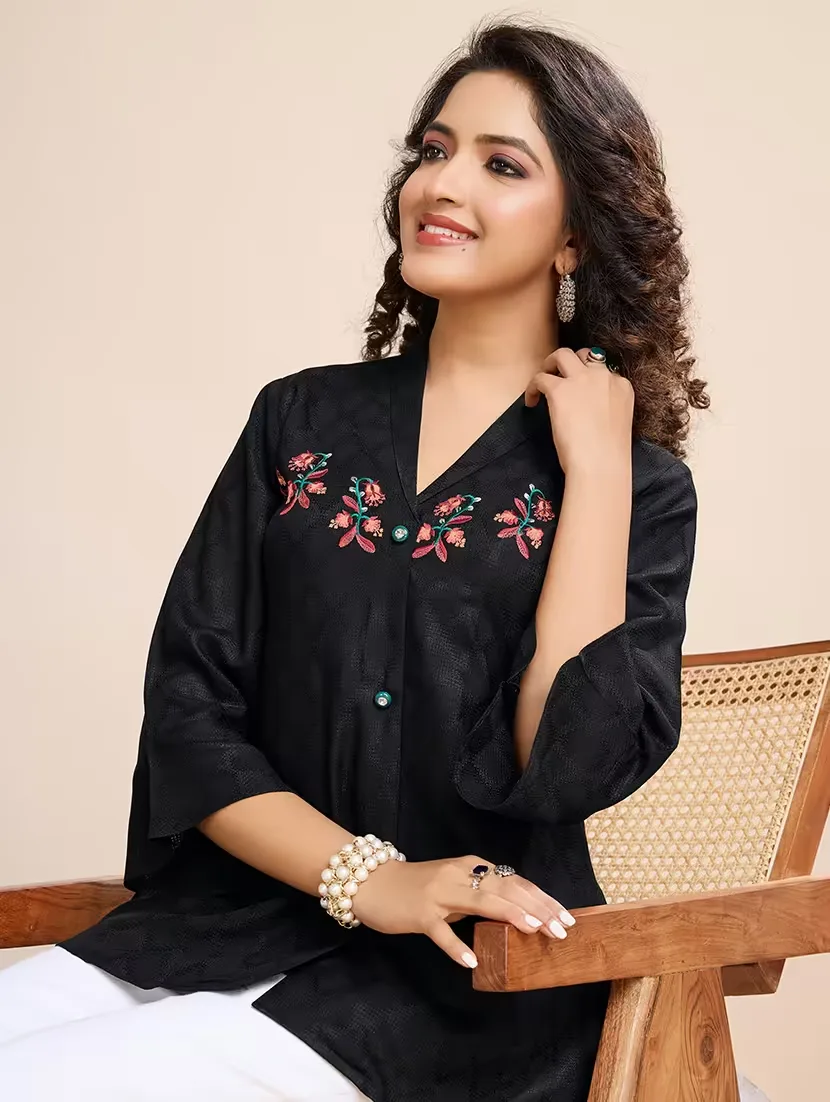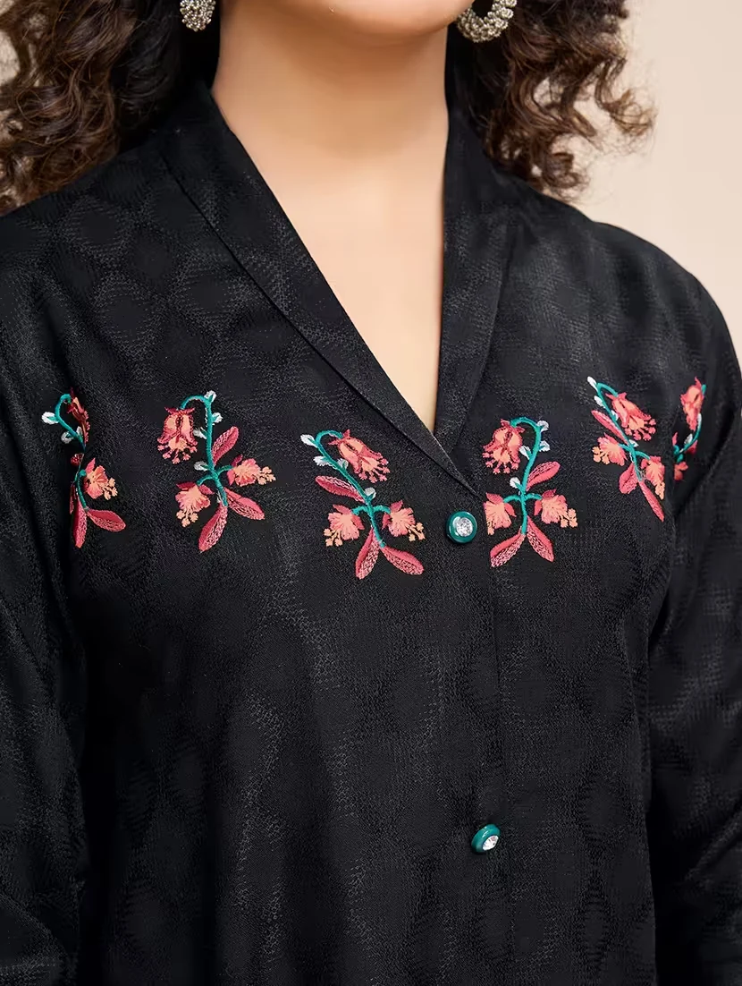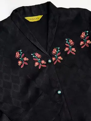 Make a statement with our Black & Red Floral Embroidered Shirt-Style Top—where bold hues meet delicate craftsmanship. Designed in a regular-fit silhouette, this woven chiffon top features intricate floral embroidery that adds a touch of elegance to its structured shirt style.