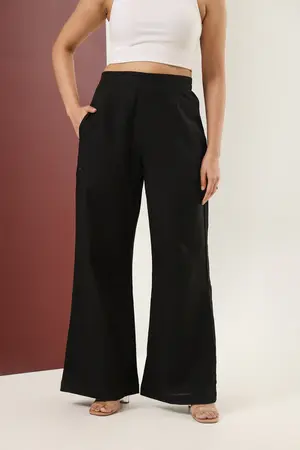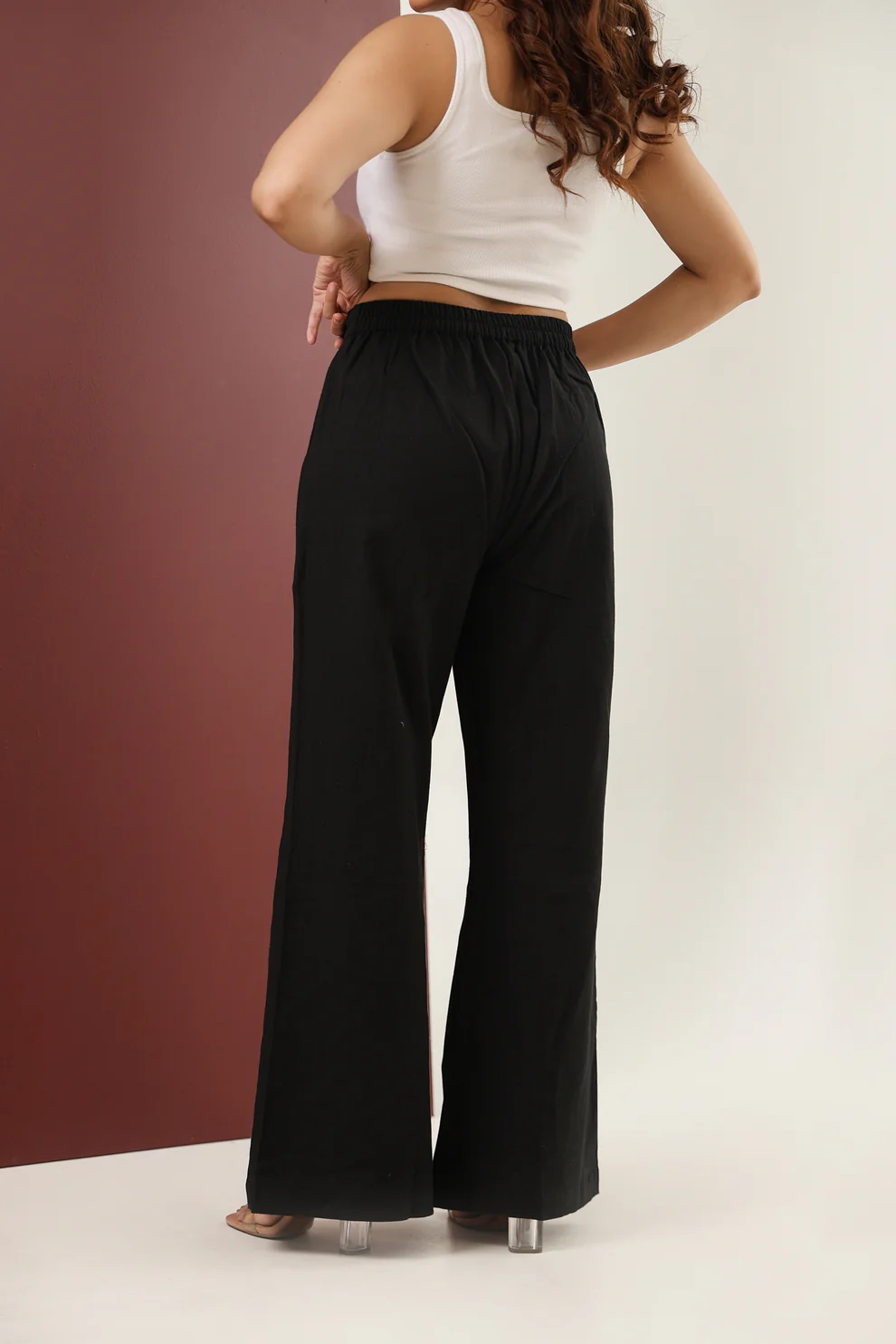Step into effortless elegance with these high-waisted wide-leg flared trousers in a rich kohl black hue. Designed for the modern woman who values both comfort and style, these pants feature: