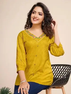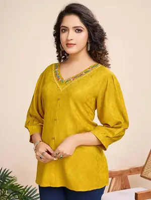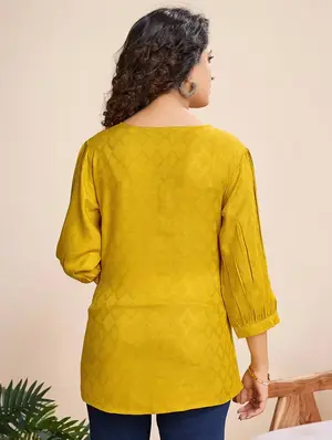 The round neckline and three-quarter regular sleeves offer timeless appeal, while the peplum cut enhances the waistline for a flattering fit. Lightweight and breathable, it’s perfect for daytime gatherings, festive occasions, or casual chic styling. Pair it with flared trousers or ethnic bottoms for a standout look.