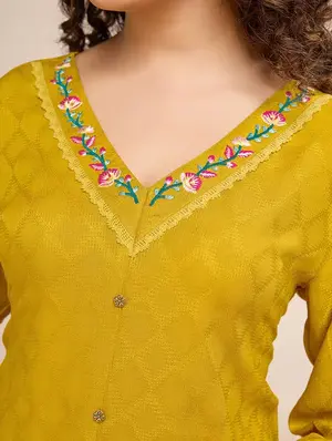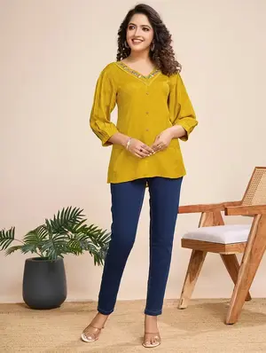 Brighten your wardrobe with our Mustard Yellow Floral Embellished Peplum Top—a celebration of color, comfort, and craft. Designed in a regular A-line silhouette, this woven chiffon top features delicate floral embellishments that add a festive sparkle to its rich mustard hue.