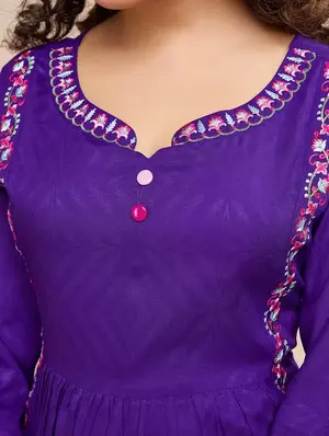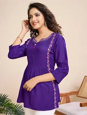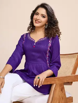 Celebrate tradition with a contemporary twist in our Purple & Pink Peplum Longline Top. Crafted from lightweight woven chiffon, this graceful piece features intricate ethnic motif embroidery that adds artisanal richness to its flowing silhouette. The round neckline and three-quarter regular sleeves offer a balanced blend of modesty and style, while the peplum cut enhances the waistline for a flattering fit.