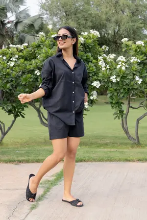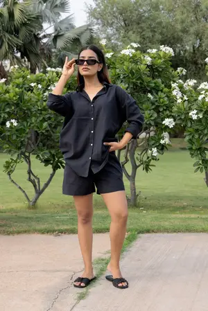 Elevate your casual wardrobe with the Royal Black Oversized Cotton Shirt & Shorts Set. Crafted from a breathable linen-cotton blend, this set promises both style and durability. Available in sizes XS to 4XL, it features a relaxed fit and an elasticated waistband on the shorts for maximum comfort.