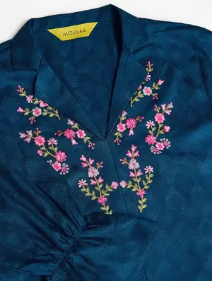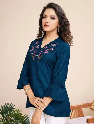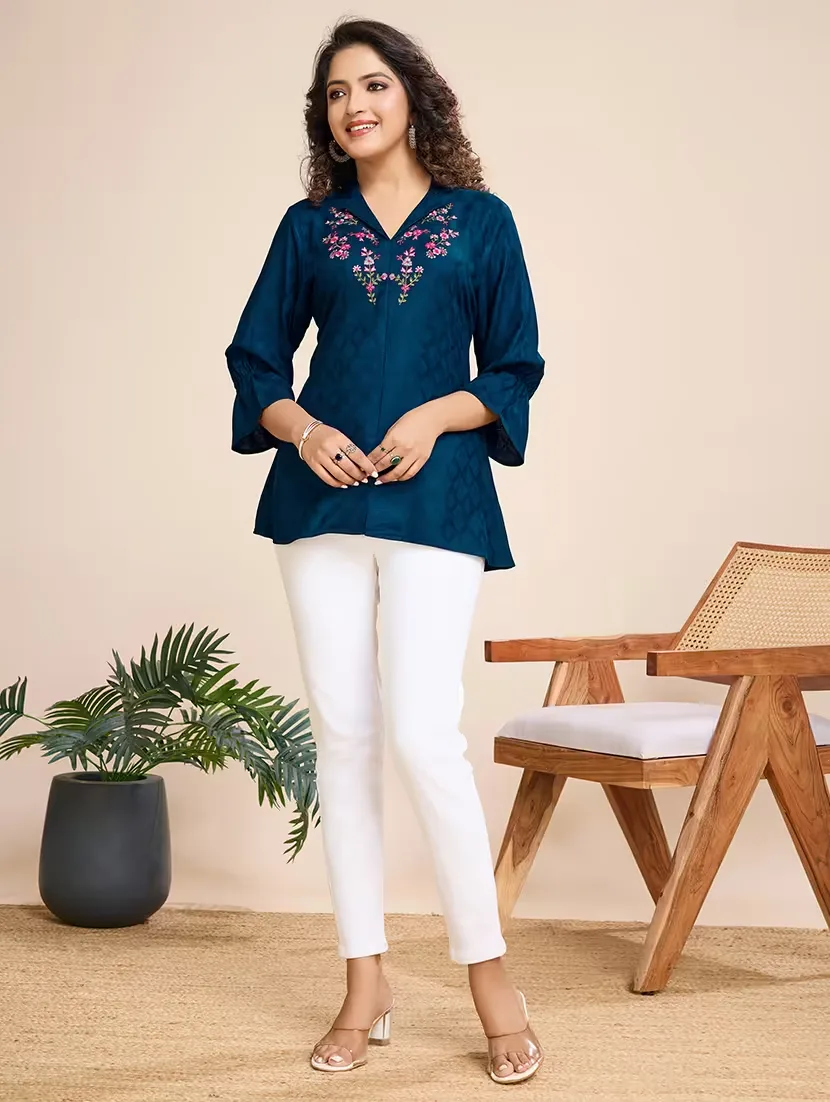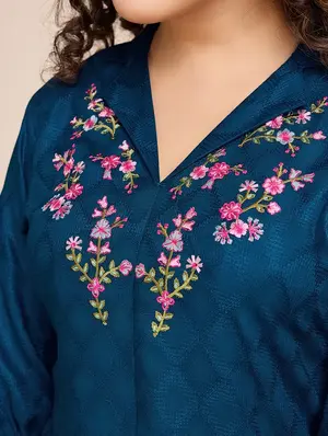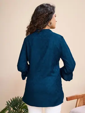 Crafted from breathable, skin-friendly fabric, it offers all-day comfort while elevating your look with artisanal detail. The rich teal hue adds sophistication, making it perfect for festive gatherings, office wear, or casual brunches. Pair it with trousers for a polished vibe or layer it over a skirt for a fusion twist.