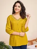 Mustard Yellow Floral Embellished Peplum Top with V Neck & Three-Quarter Sleeves