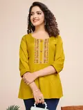 Mustard Yellow Floral Embellished Peplum Top with V Neck & Three-Quarter Sleeves