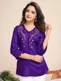Purple Floral Embroidered A-Line Top with Mandarin Collar & Puff Sleeves – Graceful & Versatile
