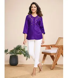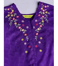 Purple Floral Embroidered A-Line Top with Mandarin Collar & P...
