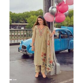 - Topwear: Fancy new silk fabrics with embroidery and handwork, often lined for structure and comfort. - Bottomwear: Divider-style pants with Kali work, typically crafted from soft synthetic or cotton blends. - Dupatta: Made from new silk fabrics, adorned with fancy lace and tassels. This mix of silk, cotton, and synthetic materials gives the collection its signature flow, sheen, and wearability—ideal for festive, casual, and semi-formal occasions.