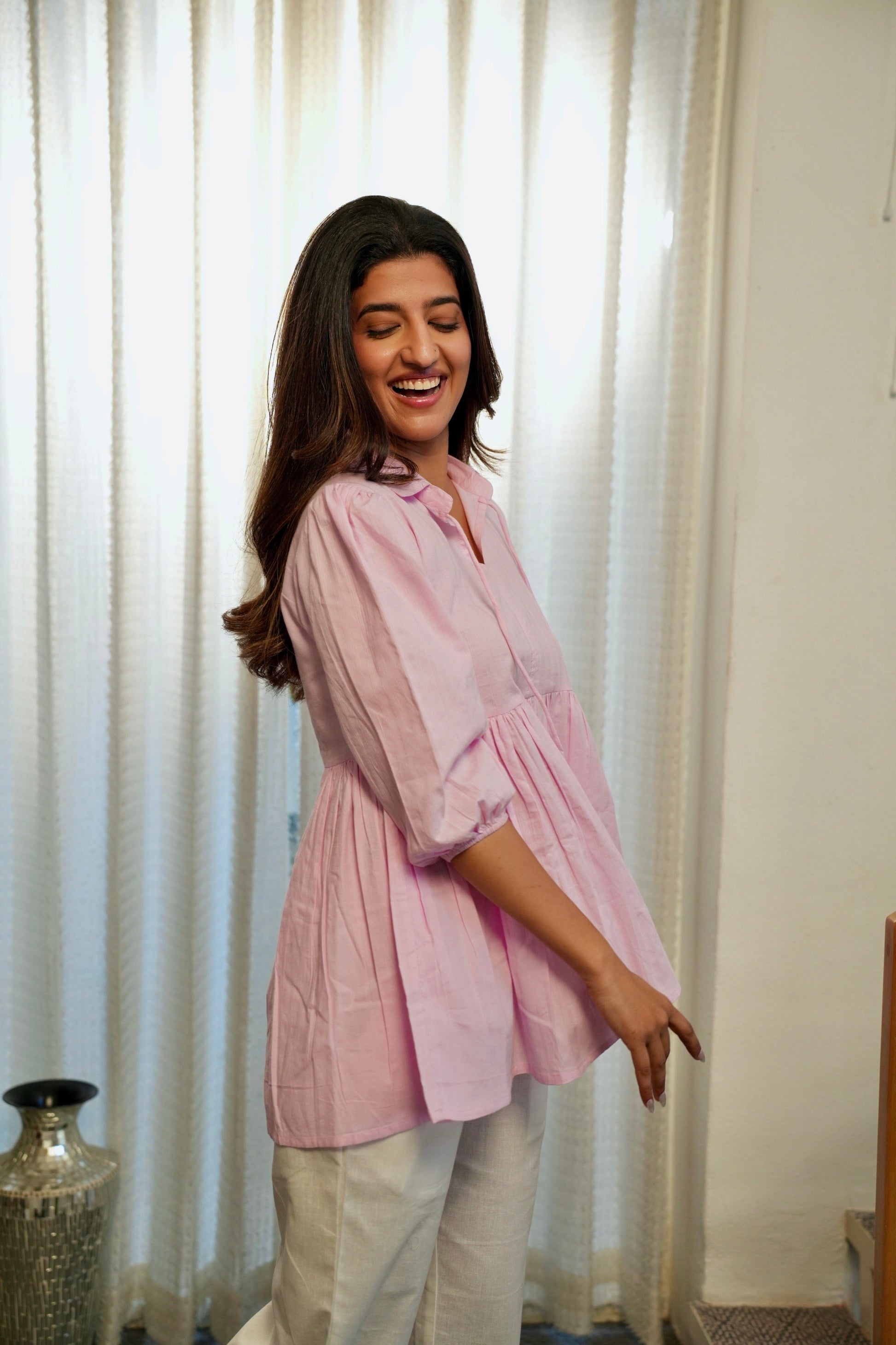 Add a touch of elegance to your wardrobe with our Peplum Tunic Top in a dreamy pastel pink! This top combines comfort and style with a collared neckline, charming tie-up detail, and a flowy peplum waist that flatters every silhouette. Perfect for brunch, casual outings, or a soft, chic look on any day!